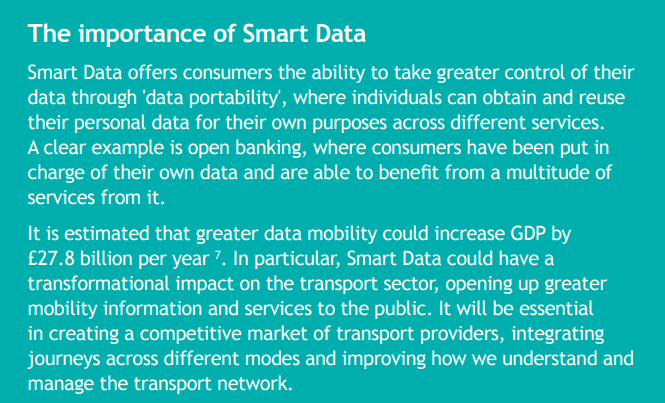“Smart Data offers consumers the ability to take greater control of their data through ‘data portability’, where individuals can obtain and reuse their personal data for their own purposes across different services. A clear example is open banking, where consumers have been put in charge of their own data and are able to benefit from a multitude of services from it.” “It is estimated that greater data mobility could increase GDP by £27.8 billion per year 7. In particular, Smart Data could have a transformational impact on the transport sector, opening up greater mobility information and services to the public. It will be essential in creating a competitive market of transport providers, integrating journeys across different modes and improving how we understand and manage the transport network.”